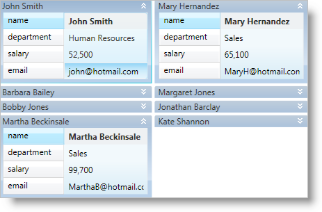 The xamDataCards™ control allows your end users to collapse (hide) a card so only its header is visible. You can collapse a card using one of the following techniques: