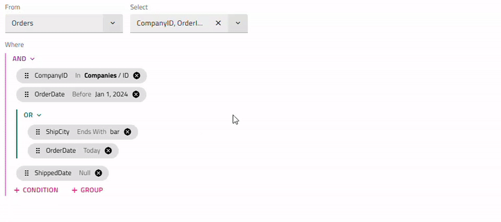 If no expression tree is initially set, you start by choosing an entity and which of its fields the query should return. After that, conditions or sub-groups can be added.
