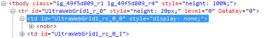 UltraWebGrid uses simpler approach to hiding columns. Each TD of the hidden column gets a style attribute with display:none; setting in it: