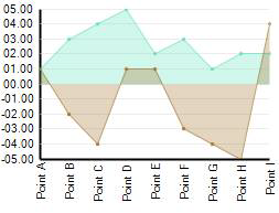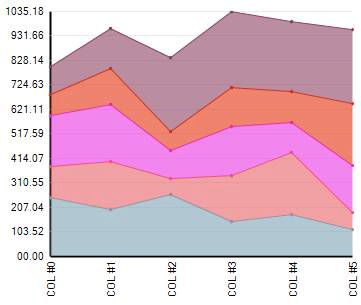 An area chart is a form of line chart, but the area between the horizontal (X) axis and the line connecting the data markers is filled with color. This makes it easy to see where the points encompassed by the different data series overlap. For more information, see About Stacked Area Charts.