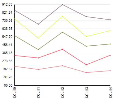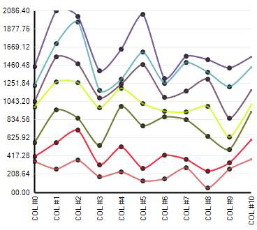 A stacked spline chart is different from a stacked line chart because it uses spline tension to connect points in each line. For more information, see About Stacked Spline Charts.