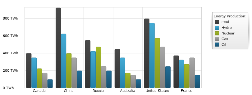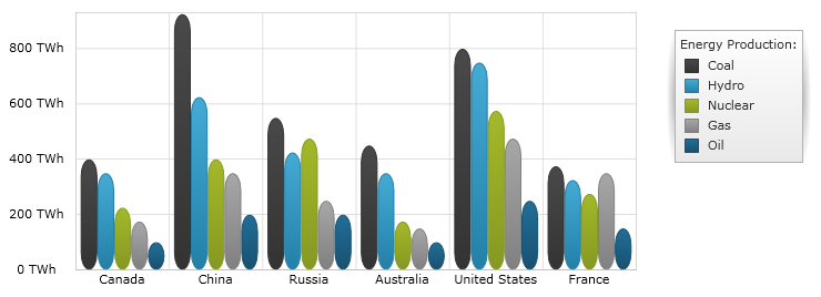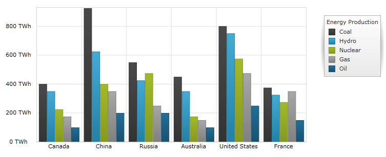 The code snippet below shows how to bind the ColumnSeries object to a sample of category data (which is available for download from Sample Energy Data resource). Refer to the data requirements section of this topic for information about data requirements for the ColumnSeries.