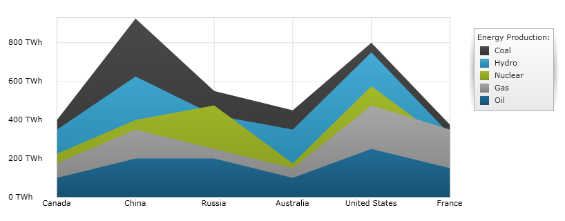 The code snippet below shows how to bind the SplineAreaSeries object to sample of category data (which is available for download from Sample Energy Data resource). Refer to the data requirements section of this topic for information about data requirements for the SplineAreaSeries.