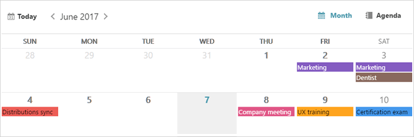 The Schedule control provides four different types of views to display dates and appointments: Day, Week, Month, and Agenda.