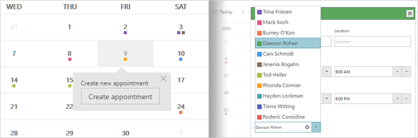 The Appointment is a core concept in a scheduling application, containing all the relevant information about an activity that will occur during some block of time, such as a meeting or an event. The Schedule component allows you to provide a collection of appointments with details such as a start date, end date, subject, and more, that are displayed in one of the four supported views. The Schedule component also provides support for recurring appointments with daily, weekly, monthly, and yearly recurrence patterns.