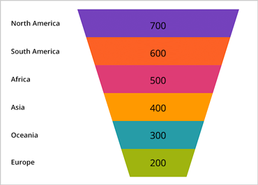 A funnel chart displays quantities as percentages of a whole, much like a pie chart. Funnel charts are commonly used to display quantitative data in relation to stages of a process. For example, a funnel chart might display expenses of a product from the manufacturing stage to the actual sale of that product.