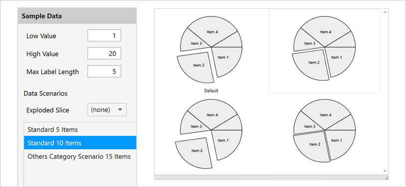 Use the Pie Chart control to drill down with tap gestures, view and select underlying data, or explode a pie section. Create simple or exploded pie charts with a customizable threshold for inclusion in an "Others" category. Display text labels within or outside of the pie without overlapping