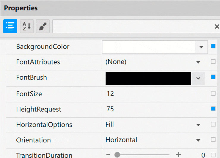 Conveniently find properties grouped by related features in the Property Editor. Features are also enabled or disabled by feature compatibility. This lets you customize any detail of the control, and it helps you learn by example, as you can see in real-time how your changes affect the control.